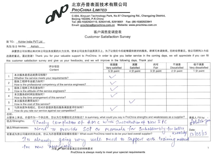 2019年8月份,北京丹普表面技術有限公司工程師再次為印度Kohler(科勒)公司購買我公司的又一批PVD離子鍍膜機設備進行了“設備全面維護服務”。通過本次服務,不僅使設備的各項性能指標恢復達到新設備的水平,而且在維護期間,對科勒工程師在生產與設備使用中遇到的問題進行了細致的解答,客戶表示非常滿意。