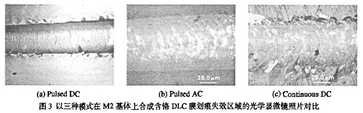 劃痕試驗(yàn)結(jié)果表明在脈沖模式下DLC膜和M2基體之間的結(jié)合力要比在連續(xù)DC模式下的要高。DLC膜的三次平均臨界載荷Lc,脈沖DC漠式下的為55N,脈沖Ac模式下的為40N,而在連續(xù)DC模式下的為25N。以三種模式在M2基體上合成DLC膜劃痕失效區(qū)域的光學(xué)顯微鏡照片示于圖3。如圖3c所示,連續(xù)DC模式下DLC膜以裂紋形式失效,并帶有一些剝離;在脈沖模式下的示于圖3a和圖3b,在脈沖DC脈沖下的在劃痕失效區(qū)域仍然保持較為完整的薄膜,只有少數(shù)輕微剝落痕跡。