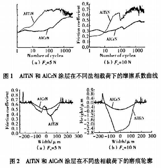 圖1示出了AITiN和AlCrN涂層在不同法向載荷下的往返滑動摩擦系數(shù)曲線,可見AITiN涂層的摩擦系數(shù)在經(jīng)歷爬升階段后出現(xiàn)明顯抖動,表明摩擦接觸界面內(nèi)存在較大的不穩(wěn)定性。相對AITiN涂層而言,AJ-CrN涂層的摩擦系數(shù)值明顯較低,且曲線平穩(wěn)性較好。此外,AlCrN涂層摩擦系數(shù)曲線的爬升階段較長,且在經(jīng)歷短暫的下降階段后曲線趨于平穩(wěn)。