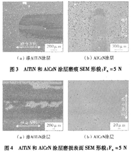 對比法向載荷為5N時(shí)的兩種涂層磨痕輪廓可知,AITiN涂層的磨損深度最大值約為1.2um,明顯高于AICrN涂層的0.6um(見圖2(a))。此外,AlTiN涂層磨痕中心有隆起狀的磨屑堆積,而AlCrN涂層磨痕內(nèi)部的磨損表面非常平整,無明顯起伏(見圖2)。當(dāng)法向載荷增加為10N時(shí),AlTiN涂層磨損明顯加劇,磨損深度最大值約2.8um,大于涂層的厚度。表明涂層已磨穿;而AlCrN涂層的磨損程度較法向載荷為5N時(shí)無明顯加重,法向載荷的增大只使得涂層的磨損深度及寬度略微增大,AlCrN涂層的耐磨性明顯優(yōu)于AlTiN涂層。