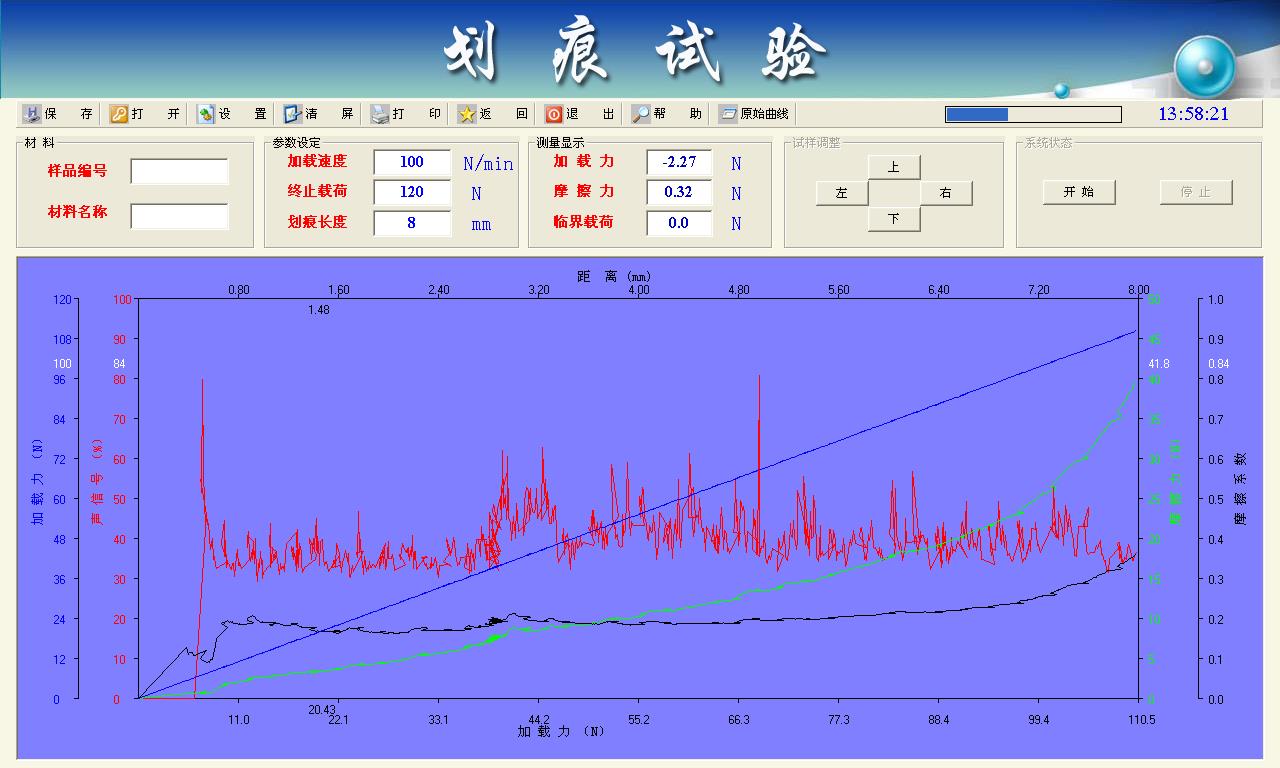 國標JB/T8554-1997是我國用來測量膜基結合力的劃痕試驗方法,是通過檢測涂層在被劃穿的那一瞬間的聲信號,來確定涂層失效點,即涂層的結合力。由于這個聲音很小,人的聽覺很難準確感覺到,一般在被測件和針頭之間安裝能接受微弱聲音的傳感器,然后將信號放大,一般用聲信號曲線上出現的第一個聲譜峰值所對應的載荷作為膜基結合力的值。