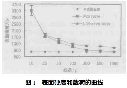 因摩擦力-載荷曲線沒有顯示出突然增大的摩擦力峰,顯然,涂層還沒有發生完全破壞,所以在Cr12MoV基體上沉積TiN涂層具有高的臨界載荷(Lc),即Lc大于60N,而且可以預測雙重處理有更高的臨界載荷,因為離子氮化過程產生的離子濺射效應,會使基體表面產生微觀的凹凸不平,因此增加了TiN涂層與基體的機械鉗合作用;其次Fe、N、Cr、Ti內擴散層的形成和對界面應力梯度的降低,也對結合力提高起到影響;而且由于中間硬化層的效應,TiN裂紋的擴展只有在基材界面上才能進行,延長了裂紋移動路徑,因此大大增加了TiN結合力。