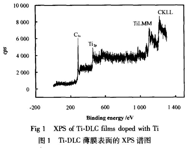 圖1所示為摻鈦類金剛石(Ti-DLC)薄膜的XPS譜圖可以看出:薄膜中除碳以外,還存在鈦(含量為6.8at%),Ti2p的特征峰位于455.1eV處,大于Ti值453.7eV,小于TiO,值458.7eV,可以判斷在非晶類金剛石薄膜中含有微晶TiC相,圖2所示為在鋼基體上所制備的Ti-DLC1(為了避免基體中Ti的干擾,采用鋼基體)樣品成分沿深度分布的曲線可見,膜層依次為Steel/Ti/TiN/TiCN/TiC/Ti-DLC,其中小于5at%的信號為儀器基底噪聲所致,同時,所含少量N可能是由于本底真空度(5×10-3Pa)不高而殘存一定空氣所致.在TC4基體上所制備的薄膜厚度約為2.81um,膜層的硬度HV0.1.25為6.51Pa(HV0.01.25=19.8GPa),膜/基結合力約44N。