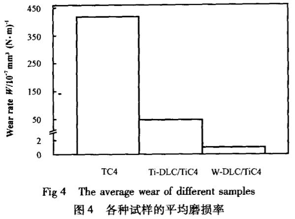 圖4所示為TC4基底、Ti-DLC/TC4及W-DLC/TC4薄膜的平均磨損率(該數據是在保載條件下計算出的,分別為TC4在200N摩擦15min;Ti-DLC/TC4在200N摩擦150min;W-DLC/TC4在300N摩擦1200min),可見:TC4基底的磨損率遠高于經DLC涂層處理的試樣;而在DLC涂層的處理中,W-DLC薄膜的磨損率更小,表現出良好的耐磨性,這是由于表面經DLC處理后硬度明顯增大,其整體承載能力增強,故其磨損深度較小,對基體材料起到了有效的保護作用,而W-DLC/TC4的硬度最高,且由于W-DLC膜層中含有WC微晶,故其體現出更優良的耐磨性。
