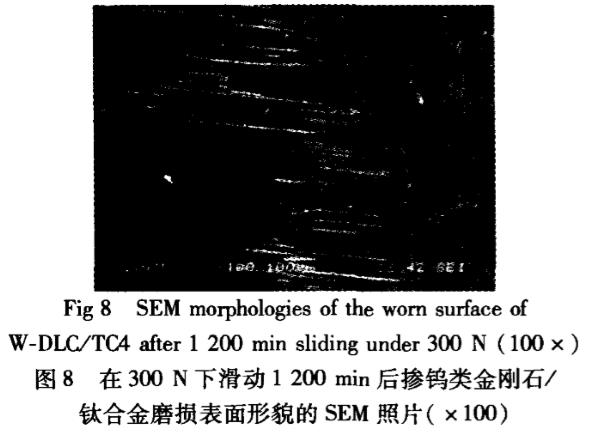 圖8所示為W-DLC/TC4在漸進加載(漸進方式如圖5上半部)至300N(為了加速試驗,選用更高載荷)保載滑行1200min后(未完全失效,停止試驗)的磨損表面局部形貌SEM照片可見:在磨痕區域主要為滑動磨損,磨粒磨損痕跡較少,磨痕很淺,這主要是由于W-DLC/TC4的承載能力較高,膜層硬度高、膜/基結合強度大的緣故,因此,經過更高載荷、更長時間后,W-DLC/TC4體現出比Ti-DLC/TC4更優異的耐磨性。