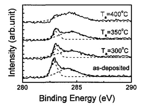備志與不同溫度退火Co65C35薄膜的C-1s譜(實線為實驗結果。虛線為擬臺結果)