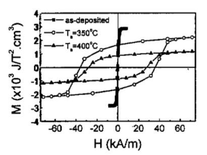 圖3為室溫下測得的制備態、350℃和400℃退火薄膜的磁滯回線,由圖可以看出,制備態薄膜呈現出軟磁特性,其飽和磁化強度(MS)、矯頑力(HC)、飽和場(BS)和剩磁比(M1/MS)分別為2.85*10的5次方J/T2cm3、0.24kA/m、2kA/m和0.2.我們的這一結果與有些報道的濺射法制備的厚100nm的非晶Co60C40膜的結果有些不同,他們的制備態薄膜為非磁性的。這可能是由于我們的制備方法不同而引起,由于真空電弧沉積幾乎是一種100%的離子束沉積方法,在襯底加偏壓的情況下,由離子束沉積引起的襯底溫升高于濺射等方法引起的溫升。與制備態磁性相比,退火態薄膜表現出了較高的矯頑力、飽和場和剩磁比,但飽和磁化強度卻略有降低,例如350℃退火薄膜,其M8,HC,B3和M1/M3值分別為2.5*10的5次方J/T2cm3,37kA/m,160kA/m和0.68。制備態薄膜的軟磁特性,是由于其非晶結構使磁晶各向異性喪失而引起;退火態薄膜的磁硬化則是薄膜中Co顆粒晶化的結果。制備態薄膜飽和磁化強度的增強與其非晶結構有關,理論計算表明,非晶Co費米面的態密度(DOS)高于晶態hcp-Co,這將使其交換能增加,從而導致非晶Co的鐵磁性比hcp-Co略有增加。