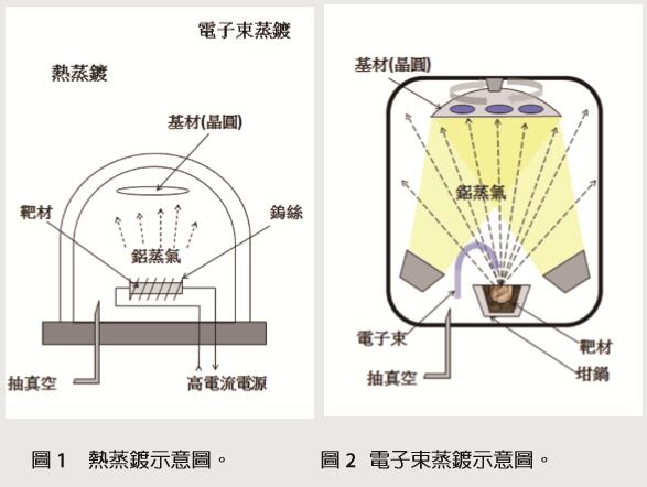 蒸鍍原理(圖1、圖2)是在高真空腔體中,放入所要蒸鍍的材料,利用電熱絲或電子束加熱升溫達到熔化、氣化溫度,使材料蒸發,到達并附著在基板(晶圓)表面上的一種鍍膜技術。在蒸鍍過程中,被鍍物的表面溫度對蒸鍍所形成的薄膜的特性有很重要的影響。基板須要適當加熱,使得蒸鍍原子可以在基板表面自由移動,如此才能形成均勻的薄膜。基板加熱至150℃以上時,可以使沉積膜與基板間形成良好的鍵結而不致剝落。